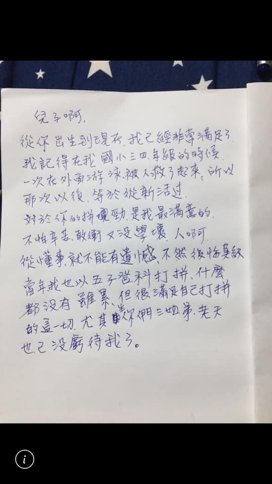 第一句就說道「兒子啊,從你出生到現在,我已經非常滿足了。」接