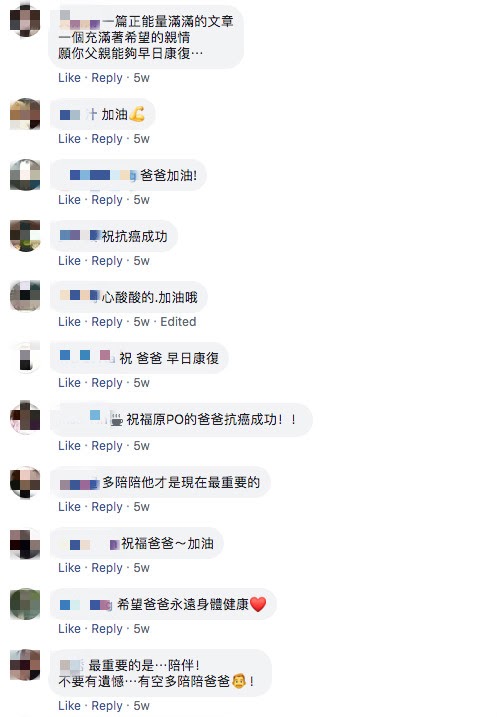 「祝福令尊治療順利,平安健康」。