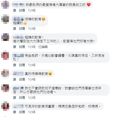 此文PO上網僅短短1小時,就掀起1.5萬人讚爆暖喊,「媽媽觀念好棒,把孩子教的好」、「洋蔥,我阿公也是做工的啊」、「真的,我也教導女兒不能瞧不起任何工作」、「像你這樣不會看不起做工的人,很少了,我也是做工的,很少遇到像你的,給你讚」、「每個職業都有不一樣的辛苦,只要認真工作,尊重是基本的吧」、「謝謝你讓社會又更溫暖了一點」、「有些老師,只是比較會讀書,水準真的很低,又非常自私」。