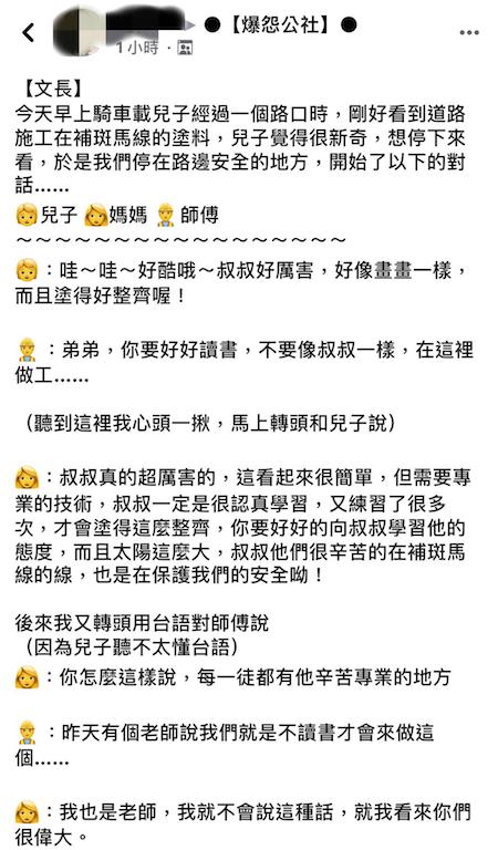 而有一位媽媽就發文,表示日前帶5歲兒子出門,恰巧看到路口正在施工畫斑馬線,當下兒子驚呼「叔叔好厲害,塗得好整齊喔」,結果一名師傅上前心酸回應,「你要好好讀書,不要像叔叔一樣!」當下原PO展現出超暖身教,不僅讓師傅重拾自信,也讓兒子學到一課,更惹哭萬人。