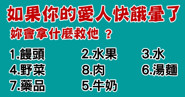 憑第一感覺! 這個測試真的很有趣,如果你的愛人快餓暈了,你會拿什麼救他?