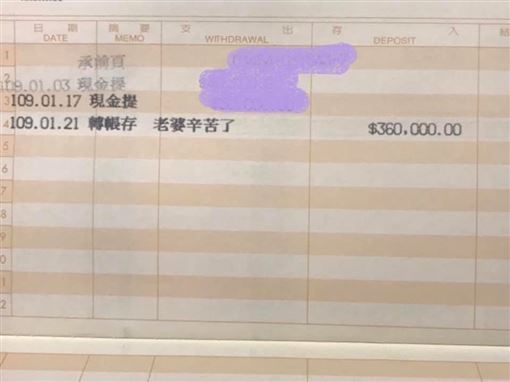 但是這位原PO的老公卻跟別人的完全不一樣!他老公為了體恤她的辛苦,將一筆錢轉進她的戶頭。她po出一張存摺內頁的照片,只見1月21日有一筆36萬的轉帳存款,備註上還寫著:「老婆辛苦了。」她回家詢問老公,老公說:「全職媽媽更辛苦,當然也有年終。」這讓她非常感動,直呼:「謝謝老公!」