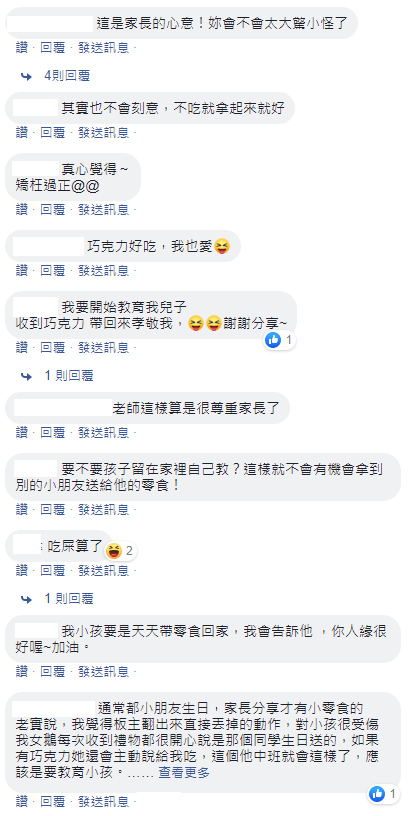 「狗才不能吃巧克力」、「巧克力從小吃到大,還是沒事」、「我小時候吃一堆巧克力耶XD」、「你能找出來 代表還沒吃進去」、「在家自學也不錯,就不會有困擾了。」、「可能有童年陰影吧」、「覺得這只是家長的一份心意,不給吃可以跟老師說,或拿起來就好欸..」