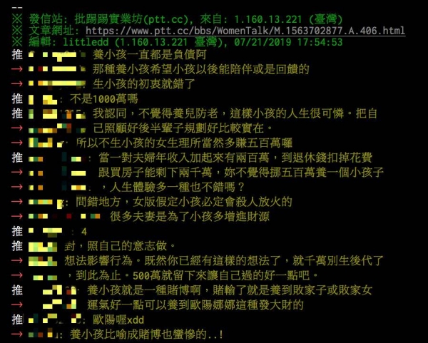近日就有位網友在PTT上發文表示,養小孩很麻煩,根本一點好處都沒有,文仲甚至提出「不生小孩等於現賺500萬元」的說法,引起許多網友正反兩派混戰,更有不少網友不認同表示:「那你還不趕快還爸媽500百萬!?」