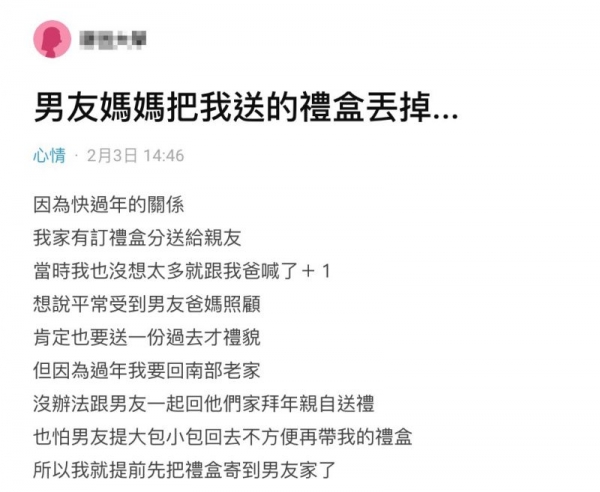該名女網友在社群平台《Dcard》上以「男友媽媽把我送的禮盒丟掉」為題發文,表示因為最近快過年了,她訂了一盒禮盒要送給男友家,想感謝男友爸媽平時的照顧。但因為過年她得要回南部老家,沒辦法親自拜年送禮,「所以我就提前先把禮盒寄到男友家了」。