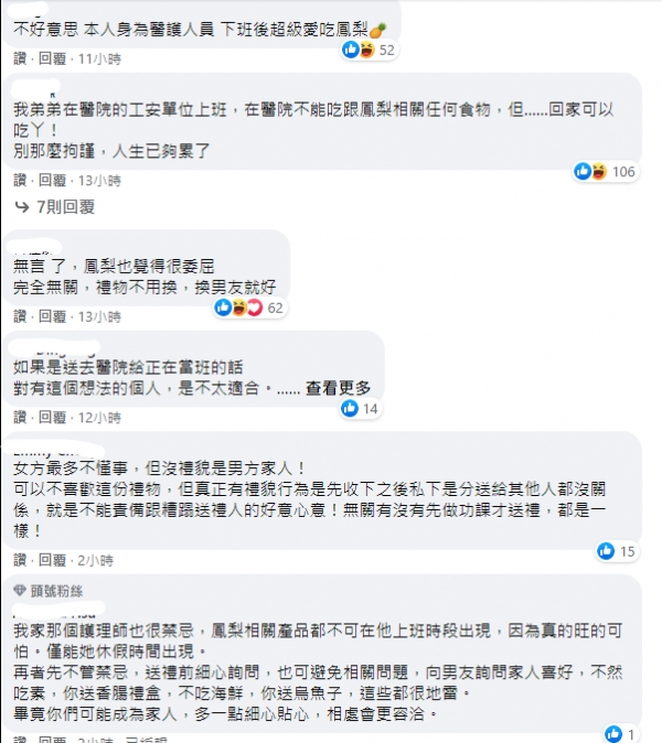 「這真的是生活常識...要送禮之前沒有先查過嗎」、「如果是我也會覺得超怪,你生活常識超不足,醫護人員已經很辛苦了還要被你詛咒,有很多事不是你說沒那個意思就能安撫的,而且對方還是長輩,警察、醫護、媒體業都不能送鳳梨,這真的很基本常識」。