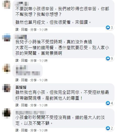 他並非責怪小孩不受控,而是爸媽知道小孩會哭鬧,且已經持續吵了好幾分鐘,應該要把小孩帶離或是在家吃就好,怎麼會把不受控的小孩帶出來餐廳內用?