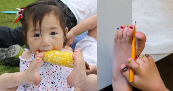蘇菲雖然沒有手臂,但是她卻能做大多數的事情,如圖中用腳寫字。