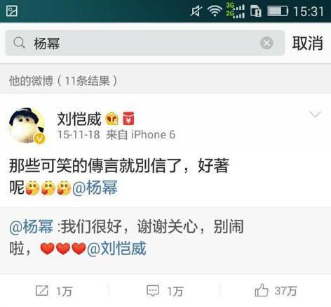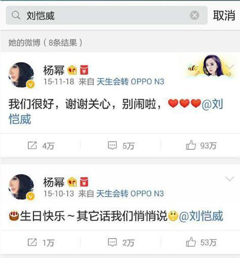 在楊冪的主頁上搜索劉愷威,相關的微博,主要就是生日祝福,幫老公劉愷威和閨蜜唐嫣宣傳新戲…