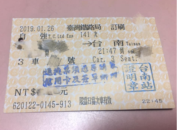 她公布車票,自己搭141車次自強號,