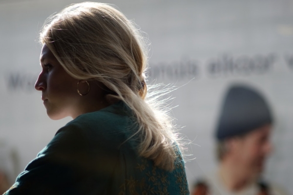 她怕自己不夠顯眼,就一個人撐著傘在雨中四處張望。