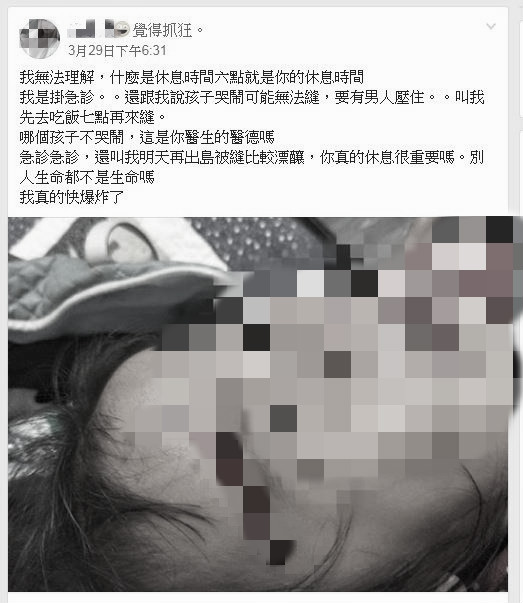 當時,女兒被物品絆倒、頭部撞到桌角,額頭不斷流血的畫面,讓這名媽媽很是心急,馬上帶著女兒到衛生所掛急診,沒想到碰上了醫師的休息時間,委婉表示:「現在是6點休息時間,孩子哭鬧可能無法縫,要有男人壓住,妳可以先去吃晚餐,7點再帶孩子回來縫,而且妳孩子一直哭,也無法縫...」這段話讓這名媽媽瞬間爆氣,認為自己掛的是急診,表示是很緊急的狀況,加上女兒的傷口不斷在流血,不幫忙處理真的很沒醫德,讓她氣得上網公審這位醫師。