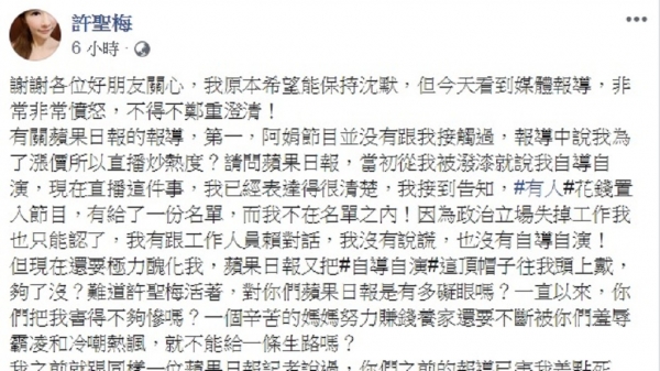 對此,許聖梅今天(20日)凌晨在臉書寫下545字長文反擊,