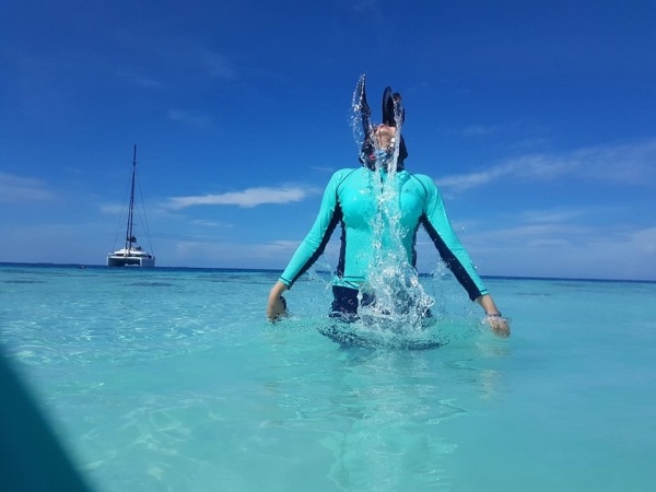 ▼原po在文中表示,到了馬爾地夫放眼望去都是薄荷綠的海洋,讓她忍不住向老公表示「我想拍出水芙蓉照!」一開始老公還似懂非懂的樣子,她再解釋「就是那種女生從水裡出來甩頭髮的照片」,讓丈夫聽完後表示「我知道了!」